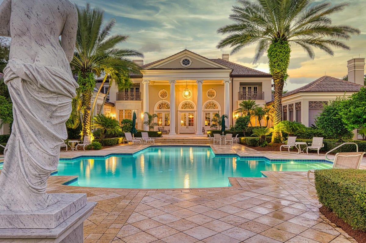 The What: The palatial estate, designed by architect team McGee Howle & Associates, is a stellar interpretation of the Georgian architectural style. Located on private Gem Island, a bridge-accessed enclave that is part of the 1,650-acre John’s Island community, the home sits on 1.4 acres with 160 feet of Intracoastal Waterway. Voluminous ceilings, intricately carved columns and eight gas fireplaces are among features of the 11,758-square-foot mansion. Outside, landscaped grounds feature an enclosed veranda that overlooks a swimming pool and cabana. Views of the Indian River abound.